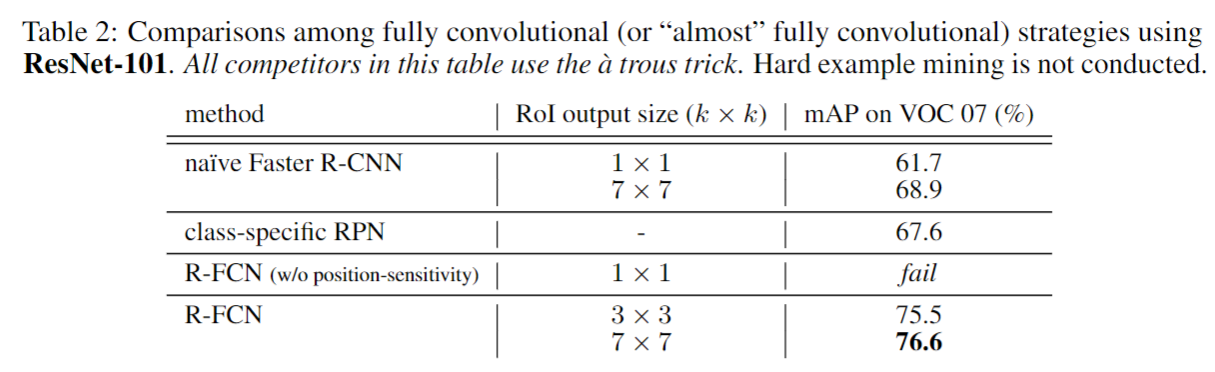我们与下面几个全卷积方法(或almost全卷积,只有一个分类fc层),使用ResNet101进行对比。朴素的Faster R-CNN使用全部的卷积层来计算共享特征图,然后RoI池化,然后使用一个21类的fc层来评估每个RoI。class-specific RPN与Faster R-CNN中一样,只不过把原来的2类分类器(目标/背景)改为21类卷积分类器。没有位置敏感性的R-FCN,我们设置k=1来移除位置敏感性,来进行对比。