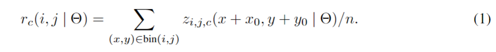 **这里rc(i,j)为(i,j)-th bin对于第c类别的池化响应。z_{i,j,c}是k^2(C+1)个分数图之中对应的那一个,(x0,y0)表示RoI的左上角,n为这个bin中像素的数量。\Theta表示网络中所有的需要学习的参数。(i,j)-th bin的扫描范围即为:**即每个bin只扫描RoI上对应的那一块,进行池化。