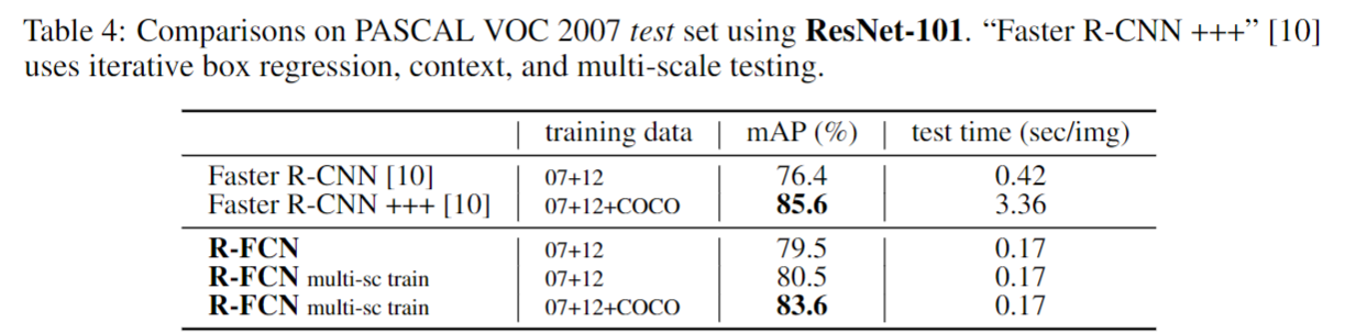 使用ResNet101作为Backbone,我们的方法在PASCAL VOC2007取得了83.6%mAP、VOC2012上取得了82.0%mAP。同时测试阶段170ms每张图像,比Faster R-CNN+ResNet101快2.5-20倍。