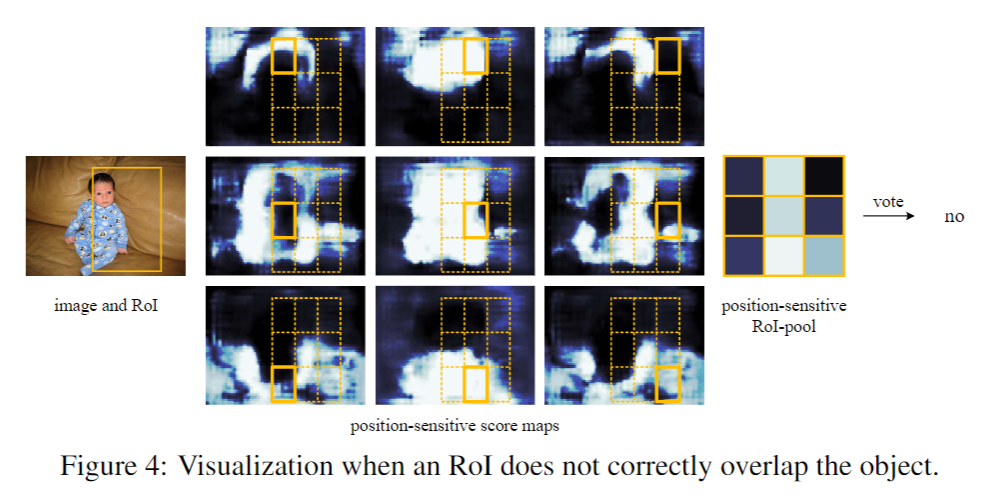 图3图4中我们可视化了k=3的R-FCN分数图。这些图对于某个目标的特定相对位置有着很强的响应。比如,“左上”分数图对于接近于目标左上位置的bin就有很高的分数响应。如图3所示,如果一个候选框与真实物体精确重叠,那么这个RoI中k ^ 2个bin中大部分的bin都会有较高的响应,这样它们的投票结果就分数很高。