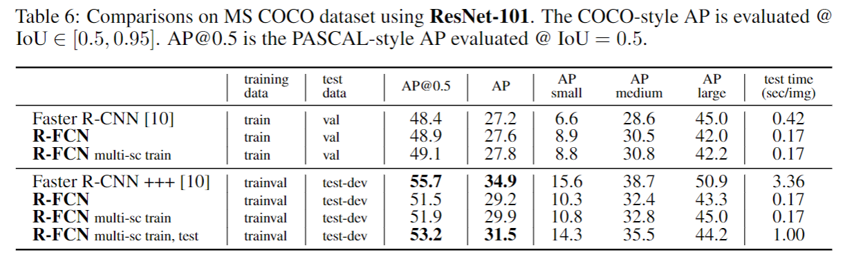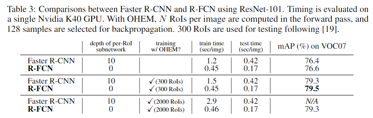 下面我们与标准的Faster R-CNN + ResNet101进行比较,它在多个数据集上取得SOTA。下面我们使用k=7,表3展示了结果。Faster R-CNN对每个区域有一个额外的10层子网络来计算,而R-FCN没有,测试时使用300个RoI,它每张图像需要0.42s,比我们的方法慢2.5倍。我们的方法训练也要更快,而且OHEM并没有给我们的训练增加额外的计算负担。使用2000RoI训练也是可行的,但是实验结果表明从更大数量的候选框中 进行mining没有提升,所以我们使用300RoI。