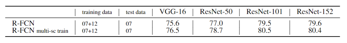 下面的表格展示了使用不同深度ResNet、以及VGG的R-FCN模型的效果。对于VGG16,fc层(fc6、fc7)替换成滑动的卷积层,并使用1 * 1的卷积层来生成位置敏感分数图。我们的网络越深,效果越好,但是深度增加到152,效果就饱和了。