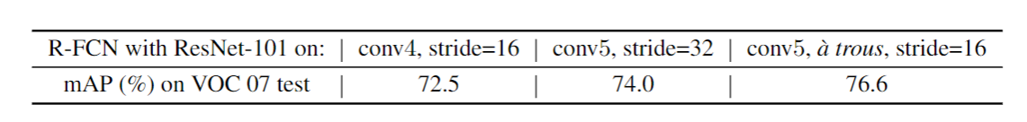 我们的全卷积结构也使用了语义分割中广泛使用的修改操作。我们将ResNet101的有效步长从32像素降到了16像素,从而增加了分数图的分辨率。conv4以及之前的操作没有改变,conv5 block中的stride2变为stride1,并且conv5中的所有卷积核变为带洞卷积(atrous)来补偿对于补偿的减小。之后的表格中展示出atrous trick提升了2.6点的mAP。