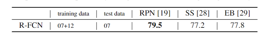 R-FCN可以使用其他的region proposal方法,比如选择性搜索SS,Edge Boxes(EB)。下面的表格展示了结果(使用ResNet101),使用RPN效果更好。