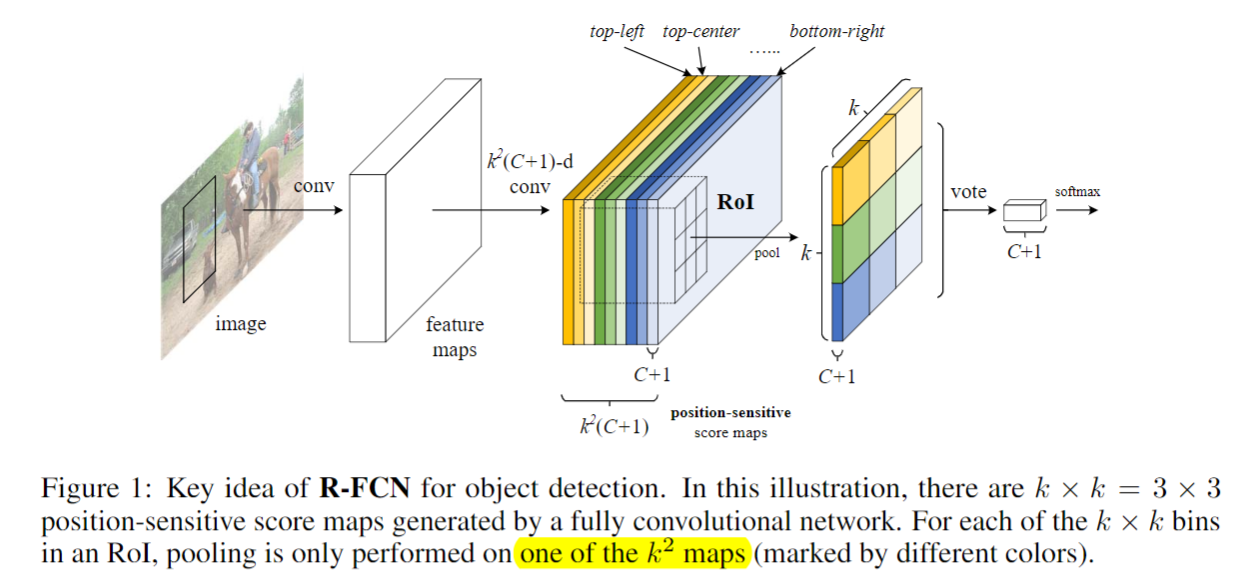 最后,得到k ^ 2个响应,在这个RoI中进行投票。本文中,我们简单使用平均分数来进行投票,**对于每个RoI,输出C+1维度的向量,表示对C+1类,该RoI的结果,之后再计算softmax,**用来计算交叉熵loss进行训练和测试时候的排序。