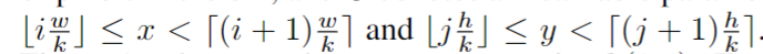 为了明确的将位置信息编码到每个RoI中,我们**将每个RoI矩形框分成k * k个bins网格。对于一个长宽为w、h的RoI,每个bin的尺寸大概是w/k、h/k。**我们的方法在最后一个卷积层对每一类目标生成k ^ 2个分数图。在(i,j)-th这个bin中(i,j范围大于等于0,小于k),我们定义一个位置敏感的RoI池化操作,这个操作在(i,j)-th分数图上进行。