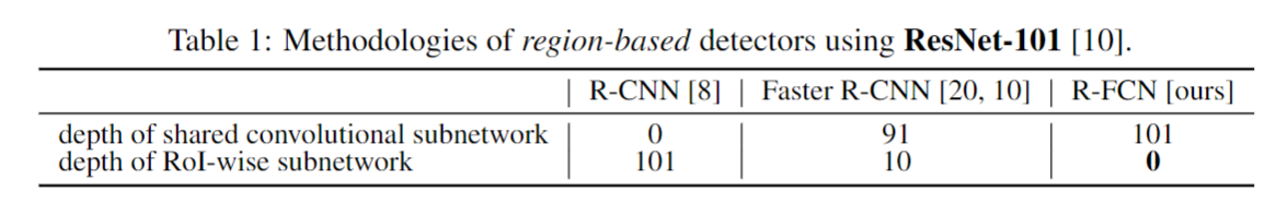 我们认为上面的问题主要是因为图像分类需要平移不变性而目标检测需要平移可变性。一方面、图像尺度上的分类任务支持平移不变性——图像中目标的漂移是没有区别的,因此卷积层这种平移不变性的结构就可以提升分类效果;另一方面,目标检测任务需要定位的表示(representation),这就在某种程度上是平移可变的 。ResNet论文中将RoI池化层插入到卷积之中,这个对每个区域进行操作的层就打破了前面的平移不变性,RoI层之后的卷积层就不再有平移不变性了,就可以很好的进行坐标回归。然而,如表1所示,这种设计牺牲了训练和测试的效率,因为它引入了很多region-wise layers,即对每个区域进行计算的子网络 ,计算量大。