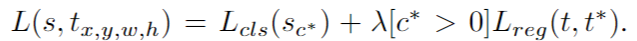 这里面c* 是RoI的ground truth标签,为0代表是背景。Lcls为分类的交叉熵loss,Lreg为bbox回归的loss,t* 代表ground truth box。[c* >0]是一个指示器,当条件满足时代表1,否则为0;即RoI为背景时,没有定位loss。我们将平衡参数 \lambda设为1。我们将与ground truth的IoU大于等于0.5的RoI设为正样本,否则为负样本。