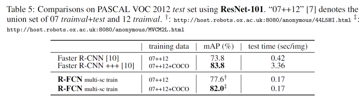 我们进行多尺度训练,训练时将每张图像随机采样为{400,500,600,700,800}像素,测试时仍是600像素。mAP为80.5%。另外,我们在MSCOCO上进行训练,然后再PSACAL VOC上进行微调,R-FCN达到了83.6%的mAP。效果接近Faster R-CNN+++,但是我们比它快20倍(0.17s vs 3.36s)。我们同样在VOC2012测试集上进行了对比,如表5所示。