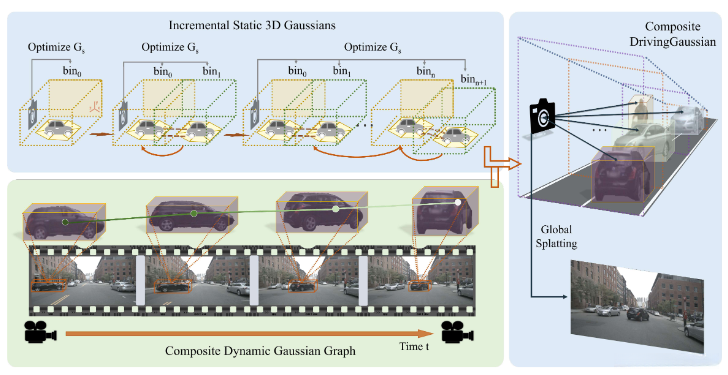 DrivingGaussian逐步建模了静态背景,并使用递增的静态三维高斯函数捕获多个移动物体。进一步利用LiDAR先验来实现精确的几何结构和多视图一致性。