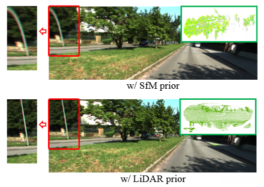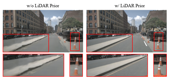LiDAR-based prior information for 3D Gaussians assists in the acquisition of more accurate geometric configurations and highly precise surface features.