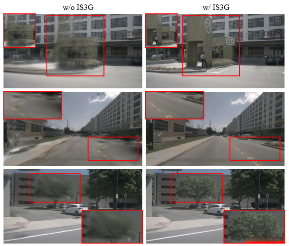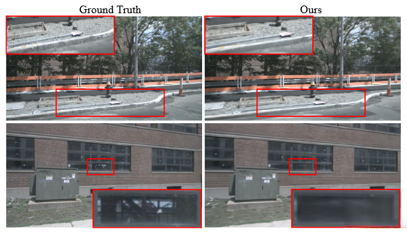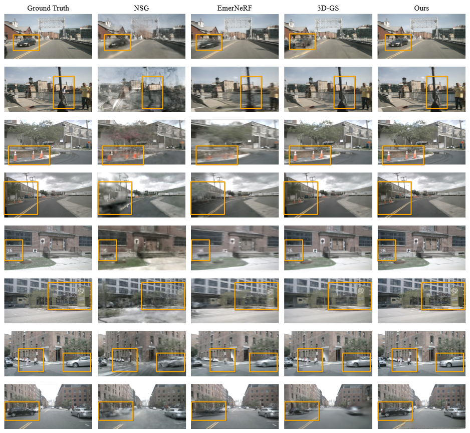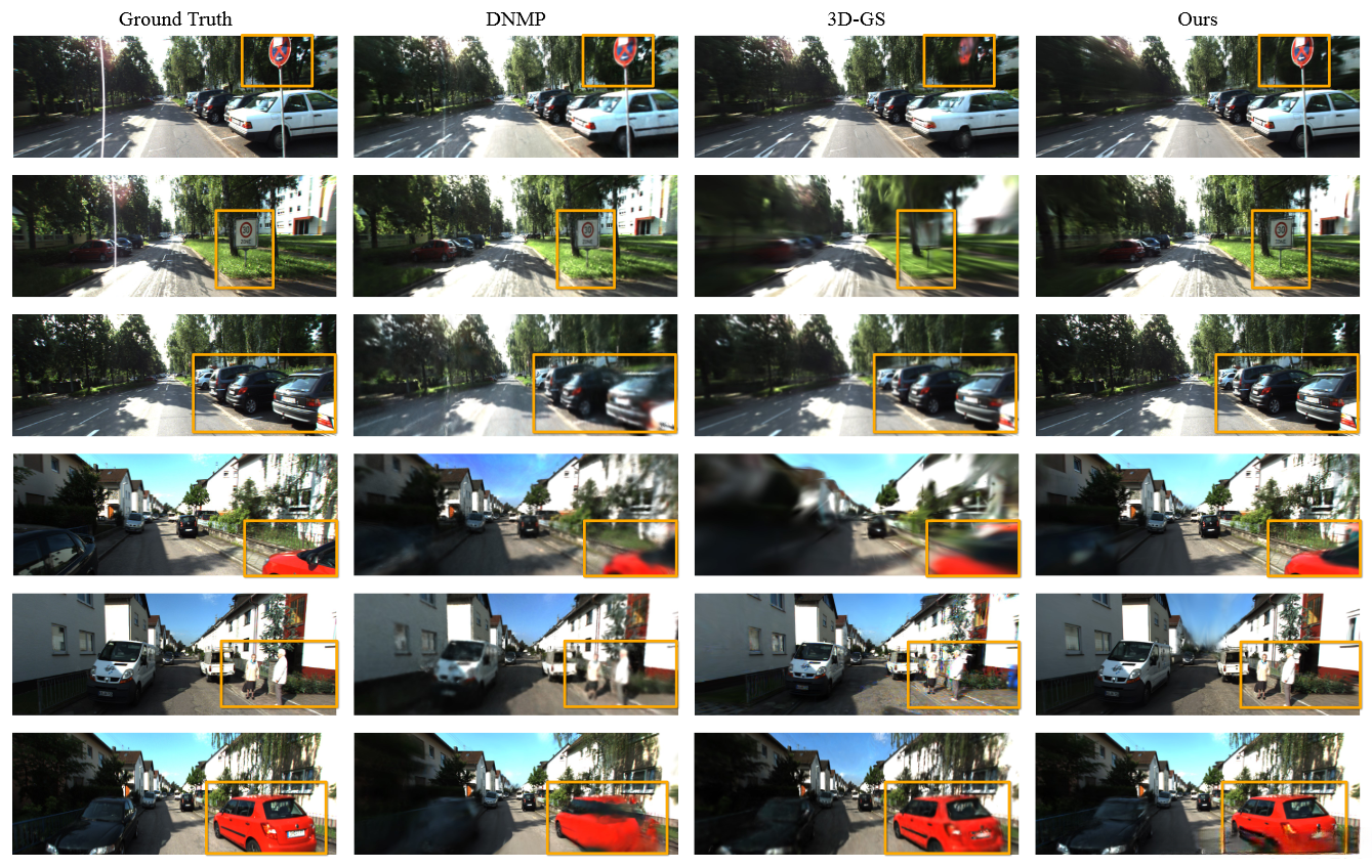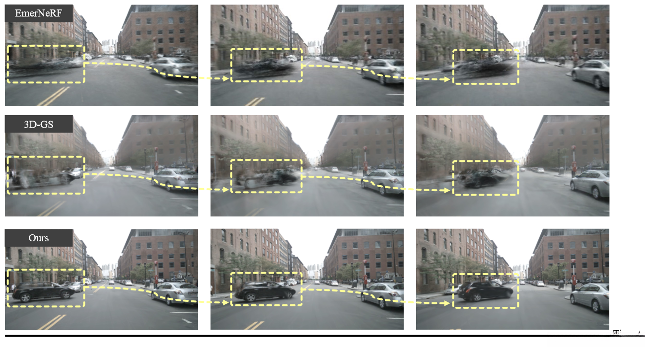 Naive approaches are prone to generating unpleasant artifacts and blurring effects in the large-scale background, while they also face difficulties in reconstructing dynamic objects and capturing detailed scene geometry.