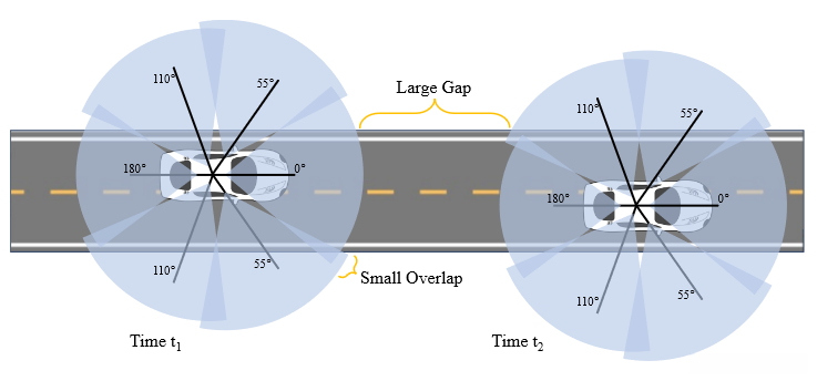 The surrounding views exhibit minor overlaps among multiple cameras, however, and exhibit major intervals over time.