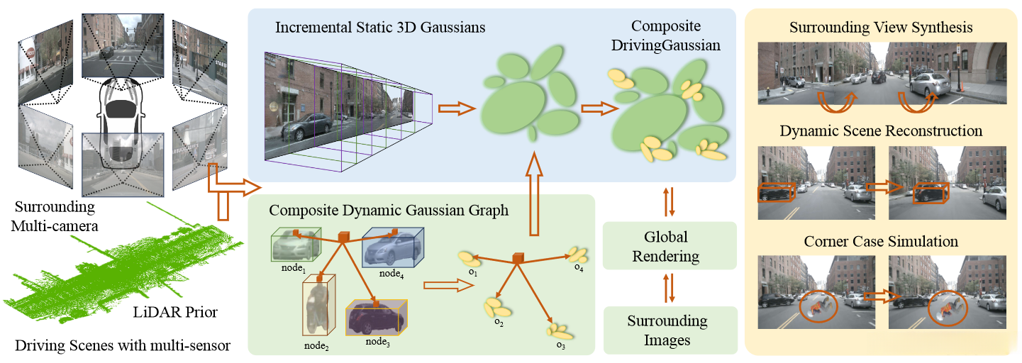 Left: DrivingGaussian acquires sequence data across multiple sensors, such as images captured by multiple cameras and LiDAR.