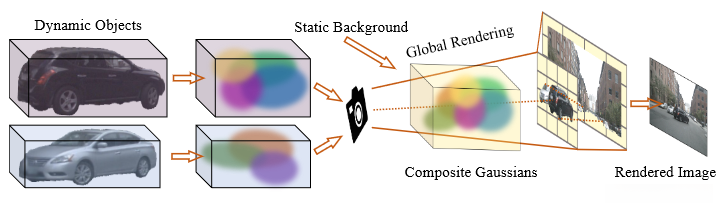Middle: 为了表示大型动态驾驶场景, 我们提出复合高斯投射, 其由两个组件构成