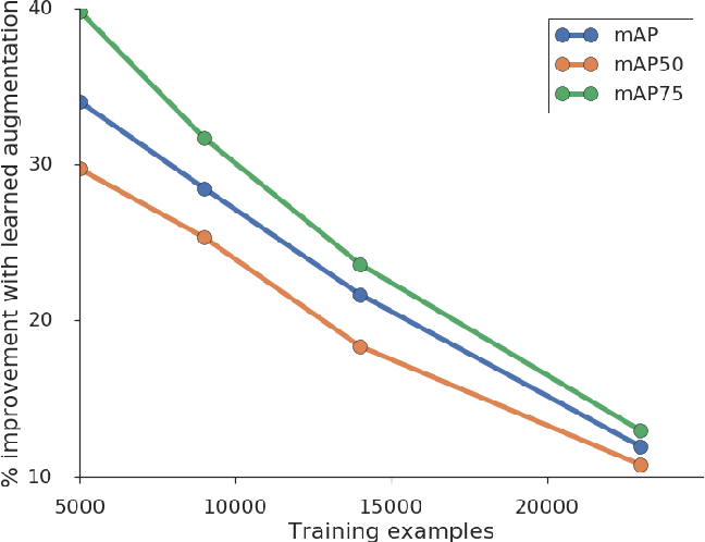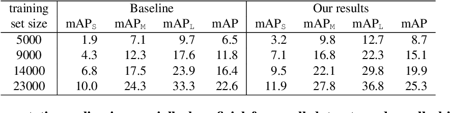 数据增强的方法一般在数据集比较少的时候比较有用。因此作者就从 COCO 中抽出来 { 5000, 9000, 14000, 23000} 张图片来训 RetinaNet,分别做两组实验:baseline,baseline + 学到的数据增强策略。结果如下:
