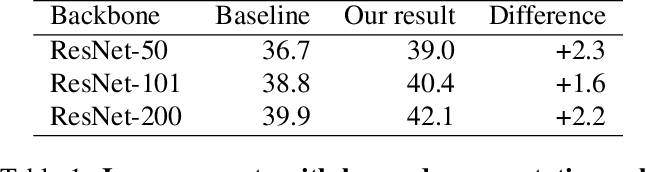 随后作者使用不同的 backbone 网络 (ResNet50, 101, 200),分别进行了两组对照实验。一组是 baseline 方法,在 RetinaNet 上使用传统的数据增强策略(0.5的概率水平翻转,multi-scale jittering,图片先 resize 到 [512,786] 之间,再 crop 成 640x640);还有一组是在RetinaNet 上使用搜出来的数据增强策略。实验结果如下表: