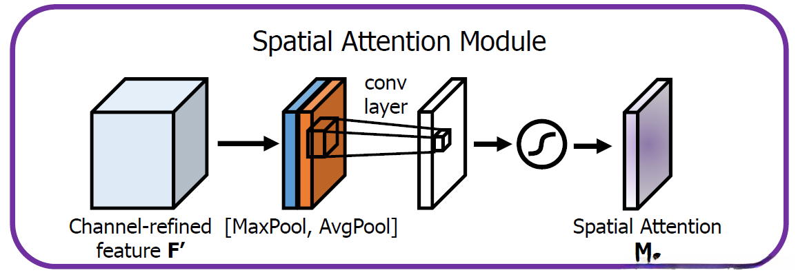 物体识别的一大难点就是现实中的场景太多,而我们的训练数据集不可能包含所有这些场景,因此对于那些所要识别的物体仅仅占图像的一小部分的任务而言,一般比较困难,因此如果能够对输入图像的物体空间信息自动的定位,就能减少背景对于任务的干扰,从而提高模型的识别精度及鲁棒性。本文通过设计空间注意模块,通过利用式3先分别对各通道的特征图的每个坐标进行全局最大及平均池化后得到两张特征图,然后对特征图进行卷积得到空间注意图。如图3所示