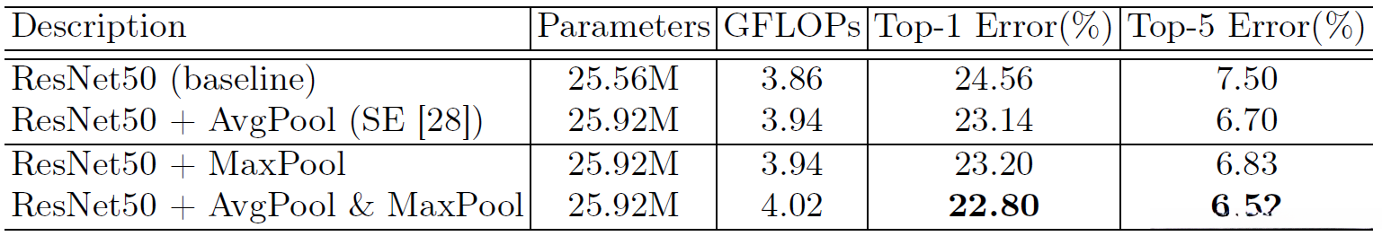 本文首先利用ImageNet分类任务来验证了同时使用特征图的全局最大池化及平均池化对性能的影响,最终的实验结果如表1所示。从表中可以看出同时使用最大池化及平均池化能够提高模型的识别精度。
