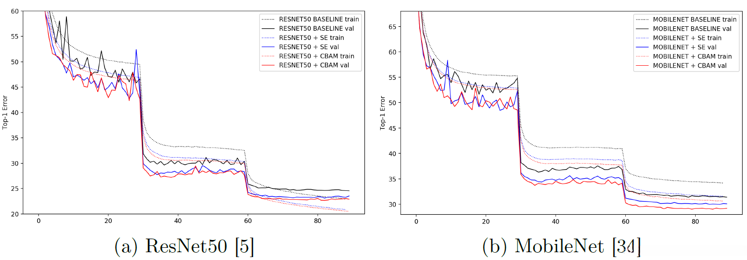 此外本文还在轻量级卷积神经网络MobileNet上进行了实验,同样证明了CBAM模块的有效性。其中ResNet及MobileNet的训练结果如图5所示。