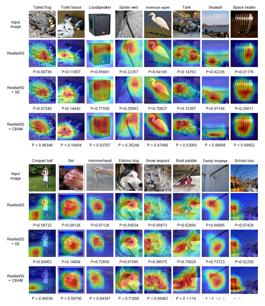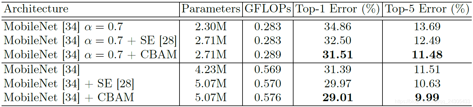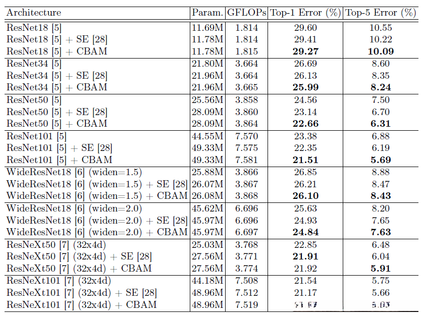 本文分别在ImageNet分类任务中对比了基础的ResNet及SENet,可以看出CBAM的有效性。