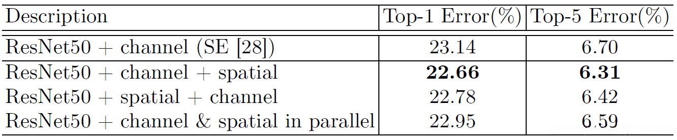 最后作者对空间及通道注意模块的连接方式进行了探索,最终实验结果如表3所示,可以看出先使用通道注意模块然后使用空间注意模块的连接方式能够获得最好的识别效果。