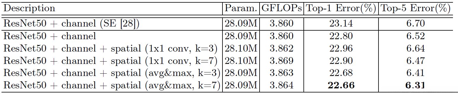 之后本文验证了空间注意模块的有效性,为进行对比,本文通过提取空间的全局最大池化及平均池化信息,然后分别对得到的特征图使用1x1卷积进行降维后直接使用或者是使用3x3的卷积核及7x7的卷积核来得到空间注意力图,最终和直接对得到的全局最大池化及平均池化图进行卷积的对比结果如表2所示,可以看出直接使用卷积能够获得最好的结果。