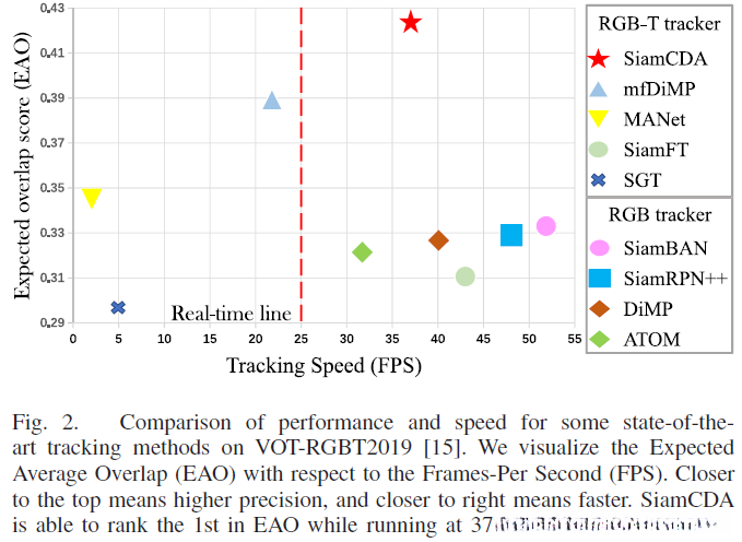 现有的RGB-T追踪器主要采用以下三种方法:1. 手工特征提取的传统方法在面对复杂场景时表现出色不足;2. 基于CNN的方法在跟踪精度上有所提升但仍然无法满足实时性需求;3. 进一步研究中提出了SiamCDA算法该方法通过引入Siamese结构显著提升了跟踪速度使其能够达到30FPS的同时保证了较高的跟踪精度如图所示本文提出了一种新型的SiamCDA算法能够在保证跟踪精度的同时实现实时性