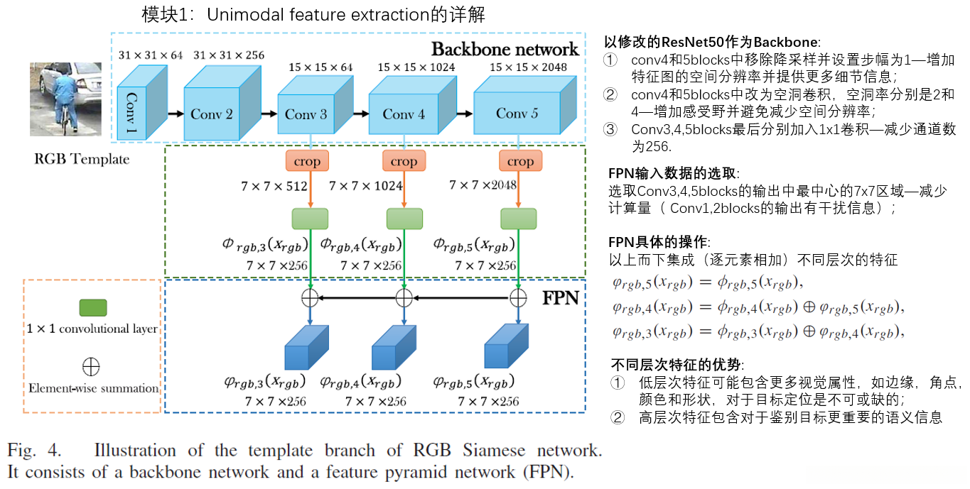 SiamRPN++基于一种空间感知采样策略已证明深度神经网络在视觉物体跟踪中的有效性。因此,在本文中我们采用了改进型ResNet-50作为backbone用于对RGB图像和热成像进行特征提取。同时由于提取的特征具有不同层次的空间与语义信息为了充分分别利用这些高阶与低阶特征本文在backbone中采用了FPNs以捕获跨层特征