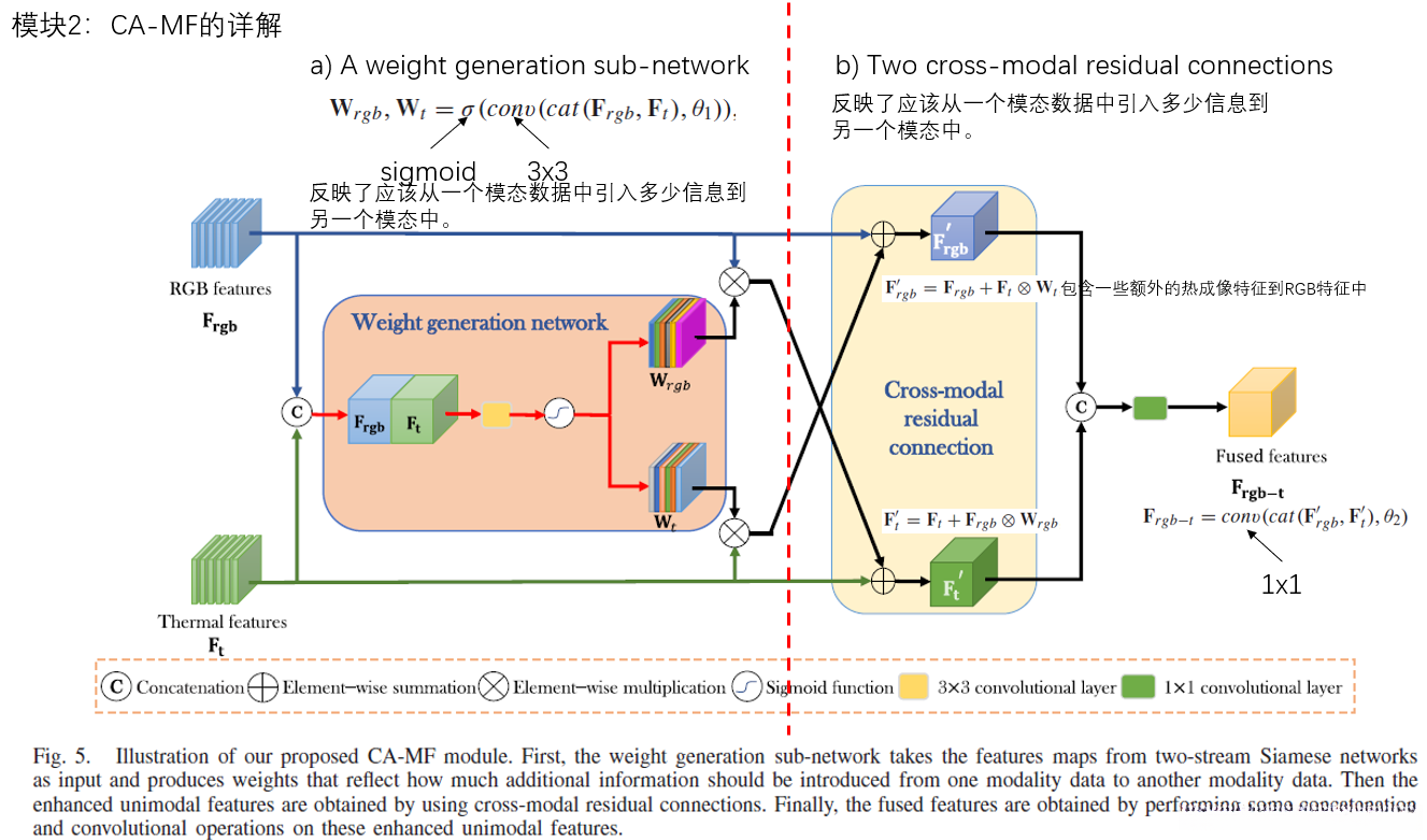 在进行RGB-T跟踪任务时,请探讨如何高效融合RGB与热成像数据是关键问题之一。现有的方法主要包括元素级求和、连接以及基于内容权重融合策略等。然而,在直接结合这两者时会降低混合特征区分能力从而影响追踪效果。实际上,在这两种传感器中存在各自独特的成像机制因而其表征特性也会有显著差异(例如极性的反转)。为了充分挖掘RGB与热成像间的多模态特性CA-MF方案被提出通过从一个传感器引入补偿信息到另一个传感器随后增强后的多模态特征求取来构建最终融合特征