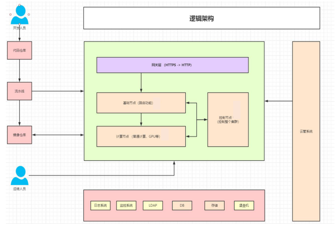 整体系统架构方案如下:运维团队负责容器集群内基础节点、控制节点及计算节点的调度配置(包括但不限于资源分配策略、带宽限制设置及任务调度规则等)的整体规划与日常维护工作。开发团队将代码提交至GitLab平台后,在CICD自动化流水线上完成构建任务并生成镜像文件;随后系统管理员会利用CICD流水线对构建好的镜像进行打包,并部署至容器集群中。