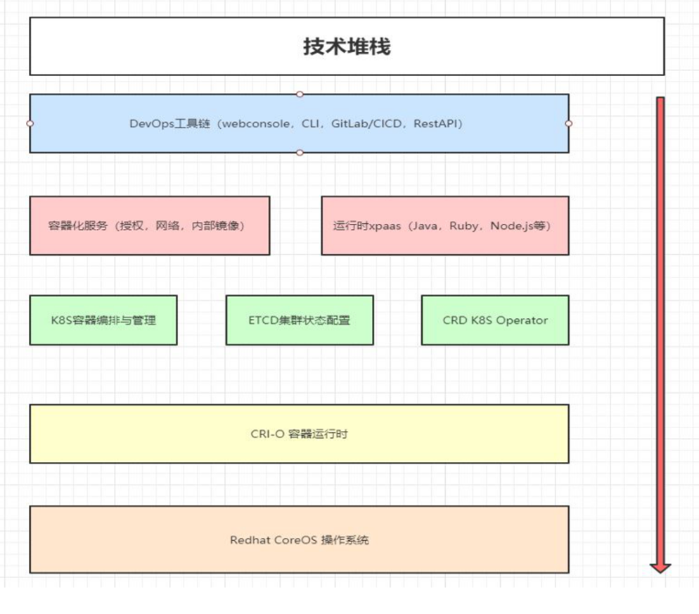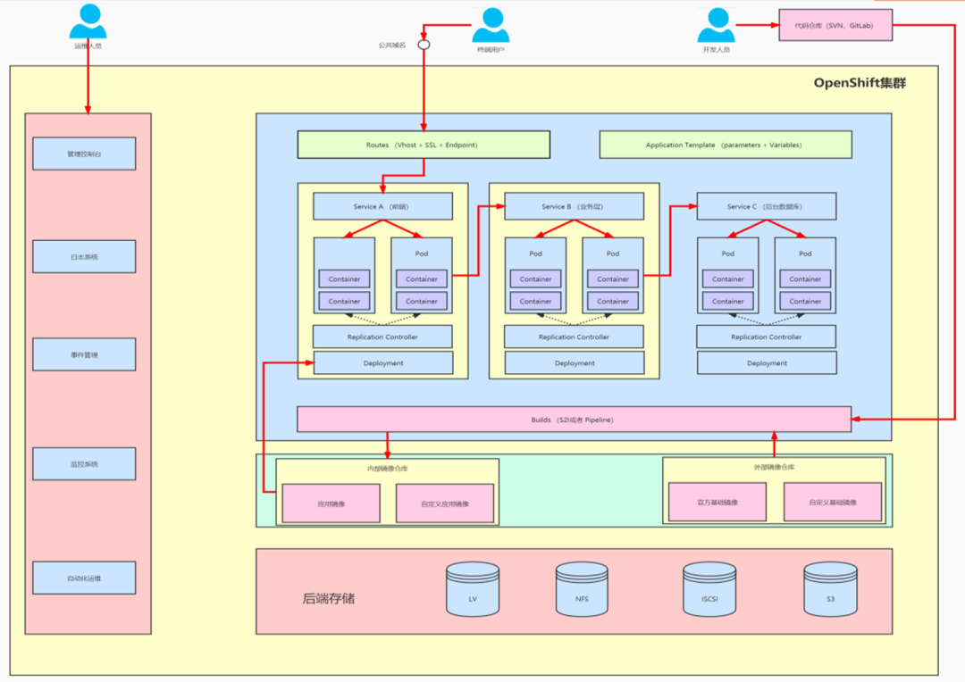决定采用OpenShift平台的原因在于这一解决方案是一个私有化的基于Kubernetes的企业级平台-as-a-Service(PaaS),主要用于通过容器化技术实现应用的部署与运行。考虑到我们当时在容器技术和人员储备方面正处于起步阶段的状态,在引入平台并进行定制适应的过程中具有较短的建设周期,并且可以通过参考同类企业的应用案例来优化实施流程。