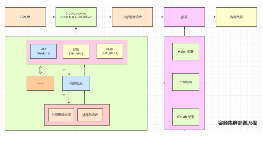 当前容器集群部署流程如下图所示:流水线通过GitLab获取代码并进行CICD流程(支持Jenkins流水线和GitLab CI两种方案)生成制品。随后生成镜像文件,并采用Helm、手动和GitLab三种方法部署到容器集群。