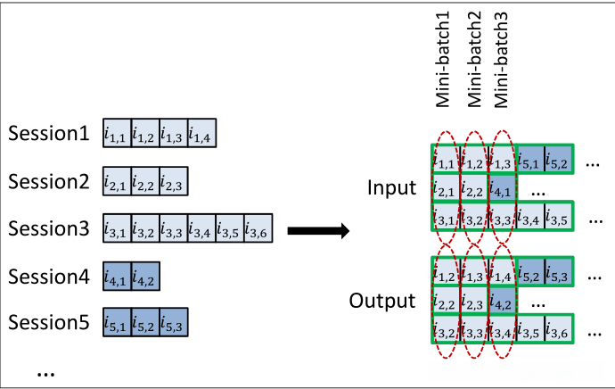 在序列问题中,RNN如果使用batch进行加速的话,就必然统一其长度,常见的策略是按照长度排序,长度相似时padding会相对比较少。另一个策略是对长序列进行截断或者剪裁成相对比较短的序列。然而这两种策略对于session推荐任务并不合适,因为由于长尾分布,长的序列和短的序列之间差异极大。 作者这里用的策略是将不同的Session给拼接了起来,在同一个序列中如果遇到下一次Session时,会将GRU中的向量参数给重新初始化掉, 因为这边GRU是对Step进行预测,所以在序列中间直接初始化掉问题也不大,这样还可以提升数据的利用率,会比简单PADDING的方式更加的合适。