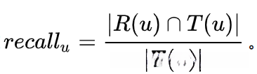 召回率(Recall) 是推荐系统在召回阶段常用的评价指标。在其他领域我们也经常会看到Recall作为评价指标,其含义为在正样本中有多少被预测为真 。那么在推荐系统中,我们通常可以通过。其中u为用户,R(u)为模型预测出的需要推荐的item的集合,T(u)表示真实的测试集中被推荐的集合。对每一个用户求得recall后求平均就可以得到整个数据集上的recall。
