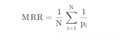 平均倒数排名(Mean Reciprocal Rank,MRR), 意义:关心找到的这些项目,是否放在用户更显眼的位置里,即强调"顺序性"。N:用户的总数量,pi:第i个用户的真实访问值在推荐列表的位置,若推荐列表不存在该值,则pi→∞。