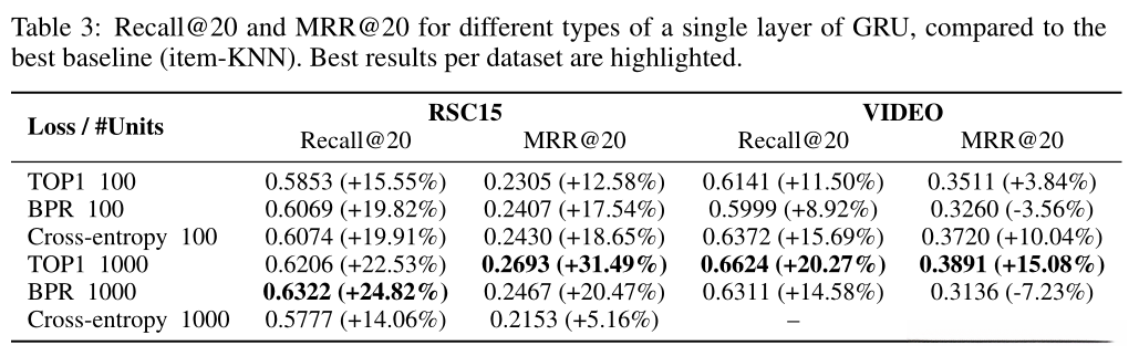 与最佳基线(item-KNN)相比,不同类型的单层 GRU 的 Recall@20 和 MRR@20。突出显示每个数据集的最佳结果。