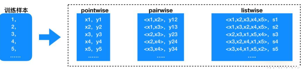 逐点排名(Pointwise) 方法是通过近似为回归问题解决排序问题,将每个查询-文档对 的相关性得分作为实数分数或者序数分数,训练排序模型。预测时候对于指定输入,给出查询-文档对的相关性得分。 成对排名(Pairwise) 方法是通过近似为分类问题解决排序问题,输入的单条样本为标签-文档对。对于一次查询的多个结果文档,组合任意两个文档形成文档对作为输入样本。即学习一个二分类器,对输入的一对文档对AB(Pairwise的由来),根据A相关性是否比B好,二分类器给出分类标签1或0。对所有文档对进行分类,就可以得到一组偏序关系,从而构造文档全集的排序关系。