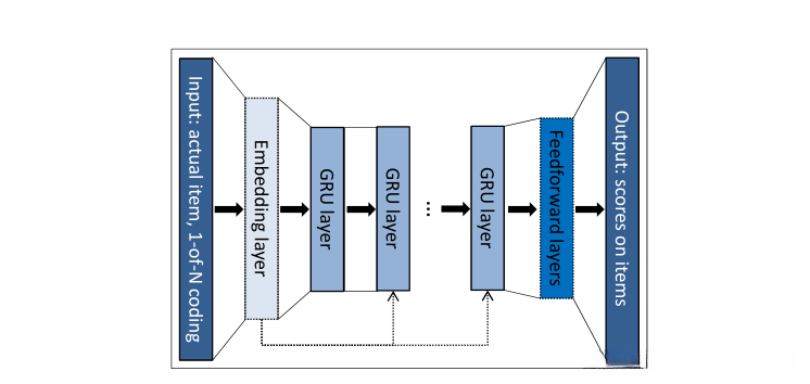 模型的结构很简单,对于一个Session中的点击序列x=[x1,x2,x3...xr-1,xr],依次将x1、x2,...,xr-1输入到模型中,预测下一个被点击的是哪一个Item。首先,序列中的每一个物品xt被转换为one-hot,随后转换成其对应的embedding,经过N层GRU单元后,经过一个全联接层得到下一次每个物品被点击的概率。