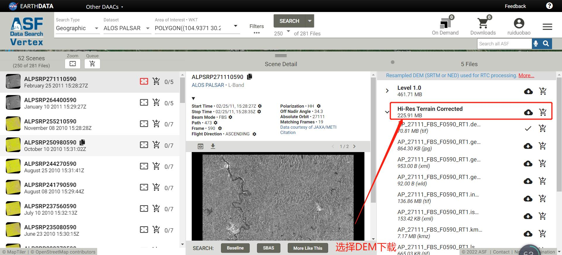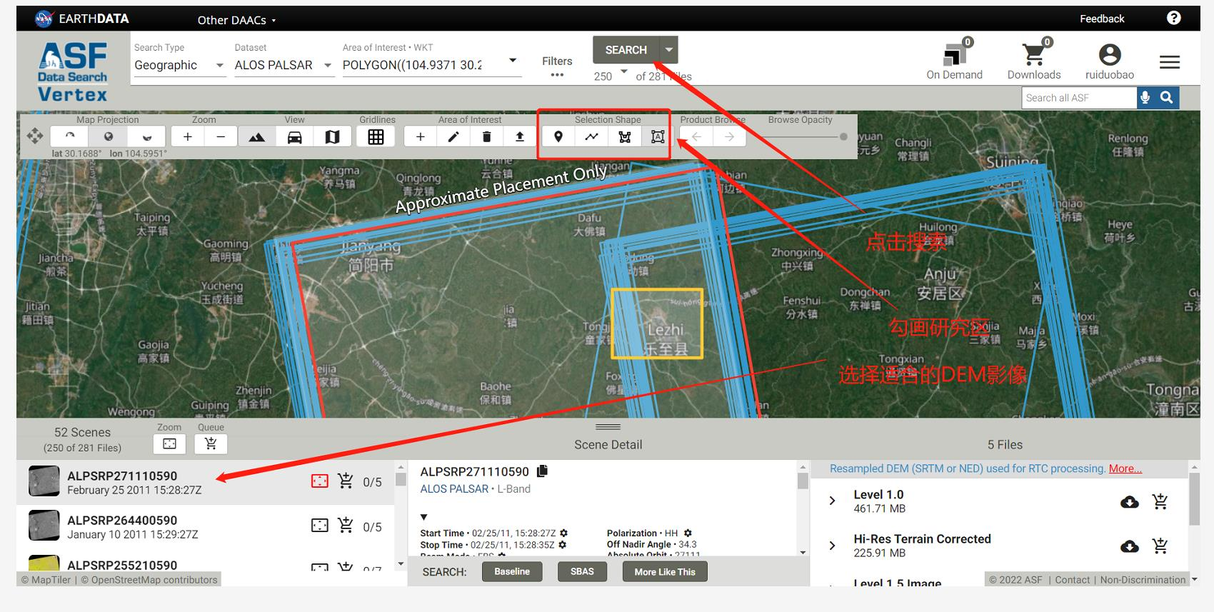 然后勾画研究区,并进行数据筛选,然后选择合适的数据进行下载: