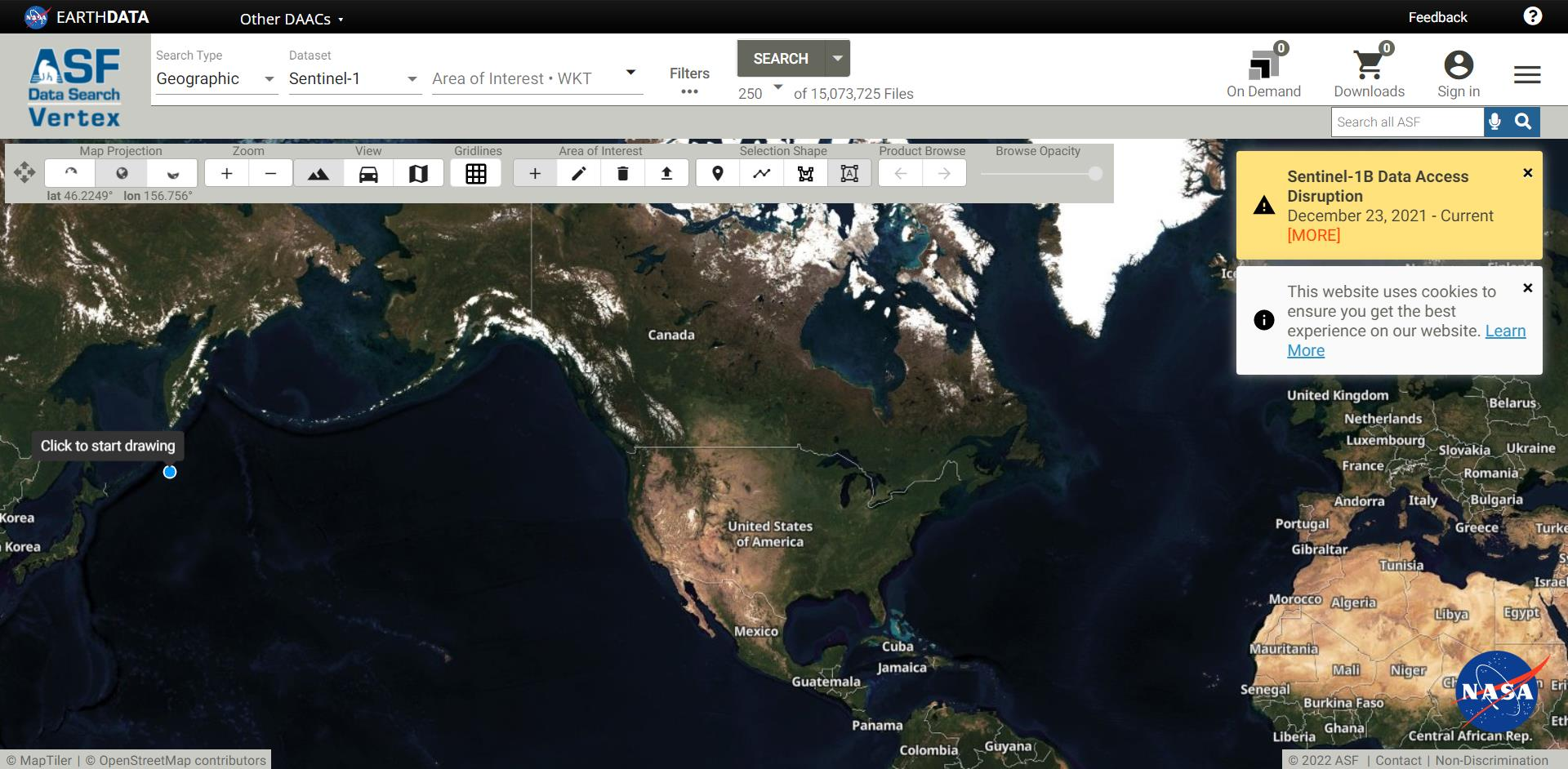 访问网站:https://search.asf.alaska.edu/#/后,在左侧导航栏找到并点击"登陆sign in"。录入NASA账户的用户名和密码。如果找不到账户,请在找不到时,请您使用您的账户:用户名为ruiduobao、密码为Ruiduobao123。