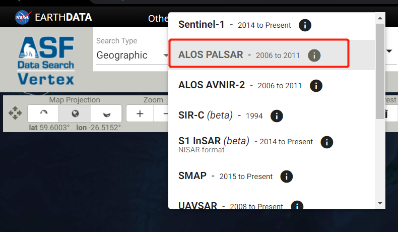 然后筛选数据集,这里选择ALOS PRISM仪器: