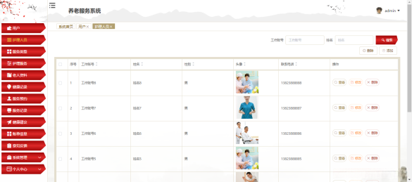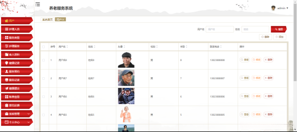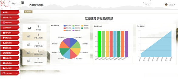 管理员进入主页面,主要功能包括对用户,护理人员,服务类型,护理服务,老人资料,健康记录,服务预约,服务记录,健康建议,账单信息,意见反馈,系统管理,个人中心等进行操作。管理员主页面如图5-7所示: