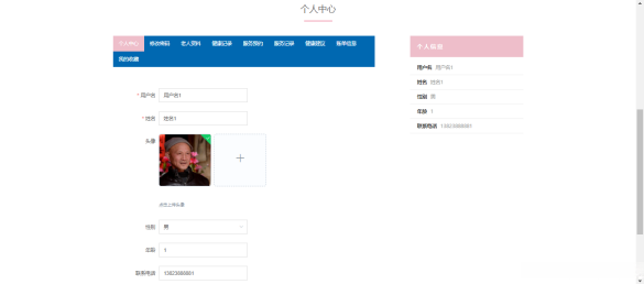个人中心:在个人中心页面输入个人信息可以进行更新操作,并在个人中心,修改密码,老人资料,健康记录,服务预约,服务记录,健康建议,账单信息,我的收藏等页面进行详细操作;个人中心页面如图5-5所示: