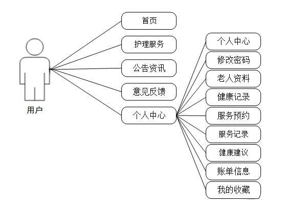 (3)用户可以实现对首页,护理服务,公告资讯,意见反馈,个人中心等信息进行操作,用例分析如图3-3所示。
