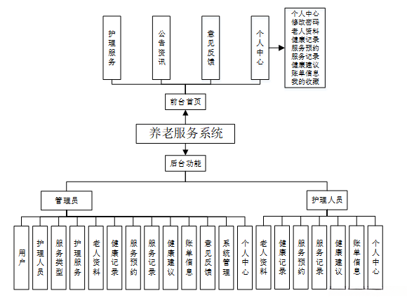 养老服务系统的建设可以为管理提供帮助,通过对一些基础信息管理实现针对性的安排,可以按照用户的角色权限使不同用户角色看到不一样的信息界面。现根据需求阶段的分析,我们可以大致确定系统需要包含的功能如下图所示: