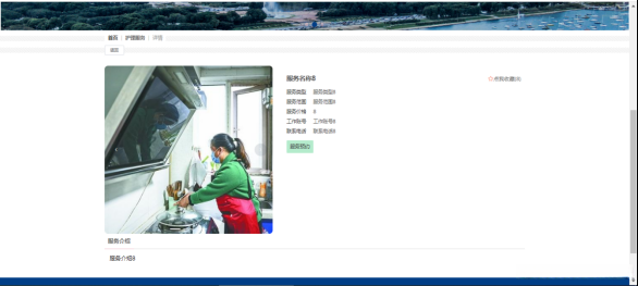 护理服务:在护理服务页面的输入栏中输入服务名称进行查询,可以查看到护理服务详细信息,并根据需要进行服务预约或收藏等操作;护理服务页面如图5-3所示: