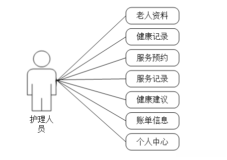 (4)护理人员可以实现对老人资料,健康记录,服务预约,服务记录,健康建议,账单信息,个人中心等信息进行操作,用例分析如图3-4所示。