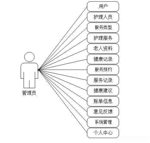 (2)管理员可以对用户,护理人员,服务类型,护理服务,老人资料,健康记录,服务预约,服务记录,健康建议,账单信息,意见反馈,系统管理,个人中心等进行基本的信息管理。其用例分析如图3-2所示。