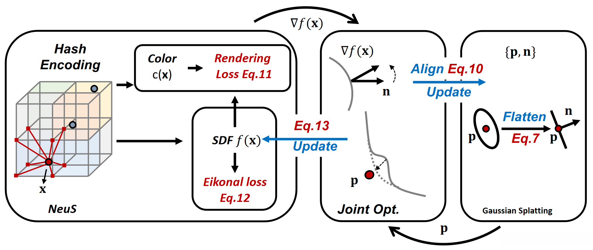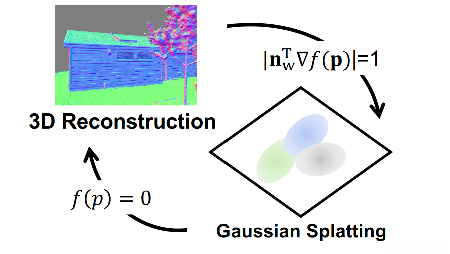 Furthermore, our method differs from the standard approach that employs static point sets as priors. Rather than using fixed points, we enhance the 3D Gaussians by incorporating normal priors obtained from surfaces predicted by neural implicit models.